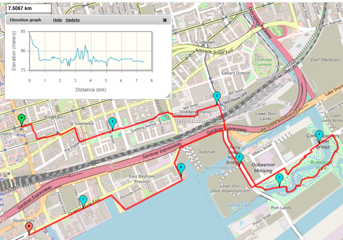 So, the random hike picker has selected this urban hike for this evening. This 8 KM hike will traverse between King Station & Queens Quay Streetcar Station. The hike will be on a combination of sidewalks and paved park trails. In terms of hills, there should be none over 25 meters. I'll attempt to stop for a washroom break in the Distillery District, located about 2 KM into the hike. | |||||||