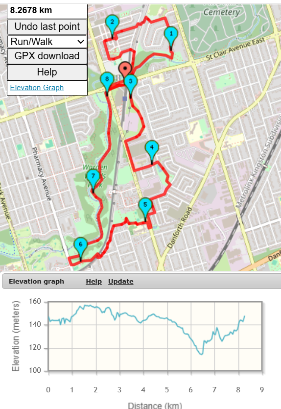 So, the random hike picker has selected this urban hike for this evening. This 8.5 KM hike will both start and finish at Warden Station. The hike will be on a combination of paved park paths, sidewalks, grassy fields and single track dirt trails. In terms of hills, there are no climbs over 25 meters. I'll attempt to stop for a washroom break at the Warden Hilltop Community Centre located about 2.5 KM into the hike. | |||||||