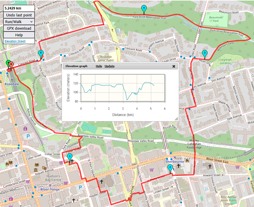 So, the random hike picker has selected this urban hike for this evening. This 5 KM hike will both start and finish at Rosedale Subway Station. The hike will be on a combination of paved park paths, sidewalks and wide gravel trails. In terms of hills, there should be one gradual climb of about 25 meters. Post hike, I might head over to the Rebel House for a pint if anyone would like to join. | |||||||
