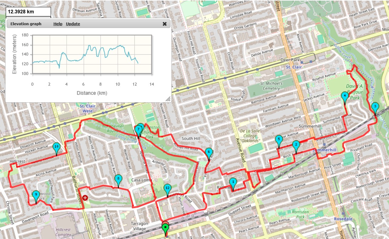 So, the random hike picker has selected this urban hike for today. This 12 KM hike will both start and finish at Dupont Subway Station. The hike will be on a combination of sidewalks, muddy single track trails, gravel trails and paved park roads. In terms of hills, there should be 4 climbs of at least 25 meters. I'll attempt to stop for a washroom break at the Wychwood Barns, located about 9.5 KM into the hike. | |||||||