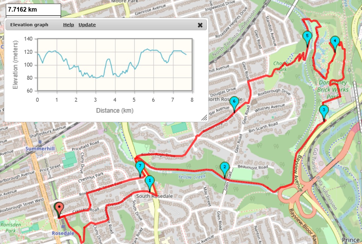 So, the random hike picker has selected this urban hike for today. This 8 KM hike will both start and finish at Rosedale Subway Station. The hike will be on a combination of sidewalks, wide gravel trails and paved park paths. In terms of hills, there should be 2 climbs of 50 meters and 2 climbs of 25 meters. I'll attempt to stop for a washroom break at the Brickworks, about 3.5 KM into the hike. Post hike, if anyone's interested, I'm going to grab a pint at the Rebel House if anyone would like to join. | |||||||