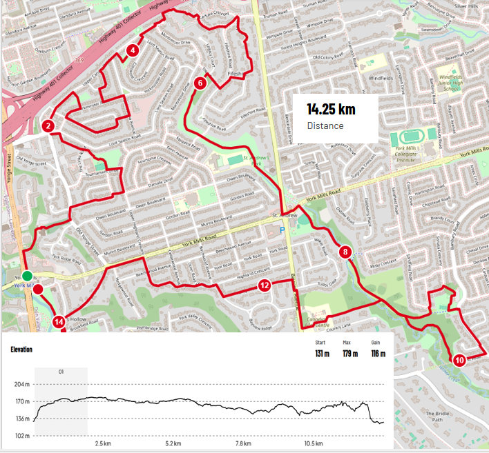 This 14.5 KM hike will both start and finish at York Mills Station. The hike will be on a combination of sidewalks, single track trails, paved park paths and grassy fields. In terms of hills, there's a 50 meter climb right at the beginning of the hike and 2 other 25 meter climbs. I'll attempt to stop for a washroom break the