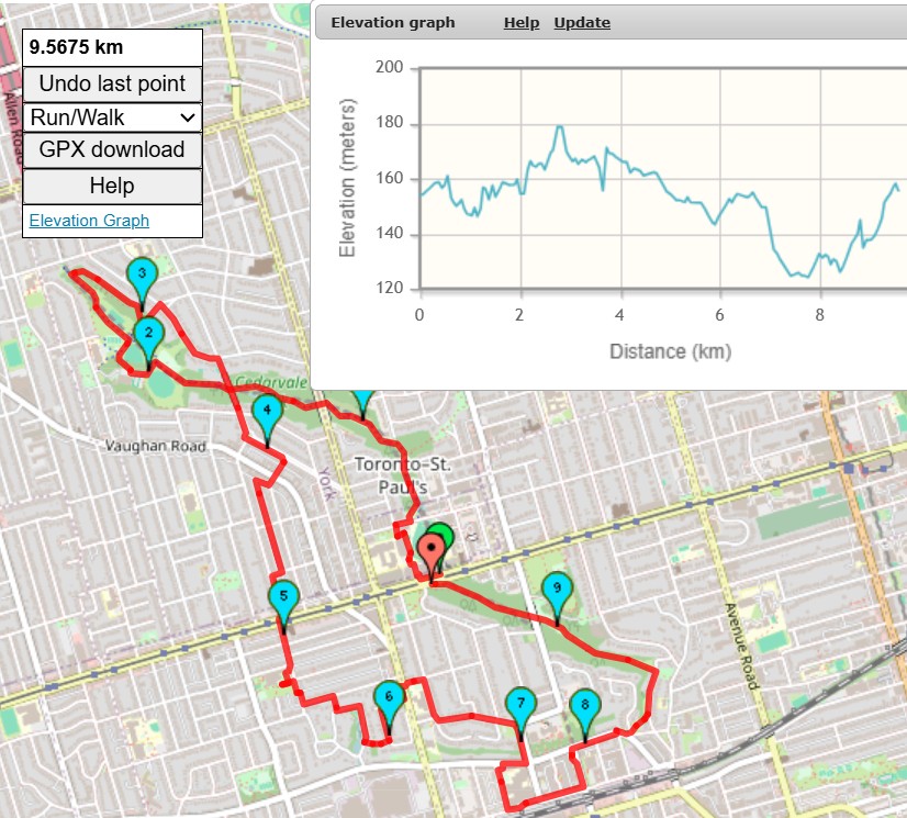 So, the random hike picker has selected this urban hike for your New Years Day. This 10 KM hike will both start and finish at St Clair West Station. The hike will be on a combination of paved park paths, gravel trails, single track muddy trails, sidewalks and paved roads. In terms of hills, there should be about 2 climbs of 25 meters. Since its New Years Day, washrooms might be