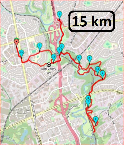 DISTANCE: about 15 km PACE: about 5 km/h DIFFICULTY: D4 DIFFICULTY: pace and distance, terrain a bit tricky in places, but nothing severe WASHROOMS: Starbucks before the hike, trees during the hike We will start at the Shops at Don Mills, then