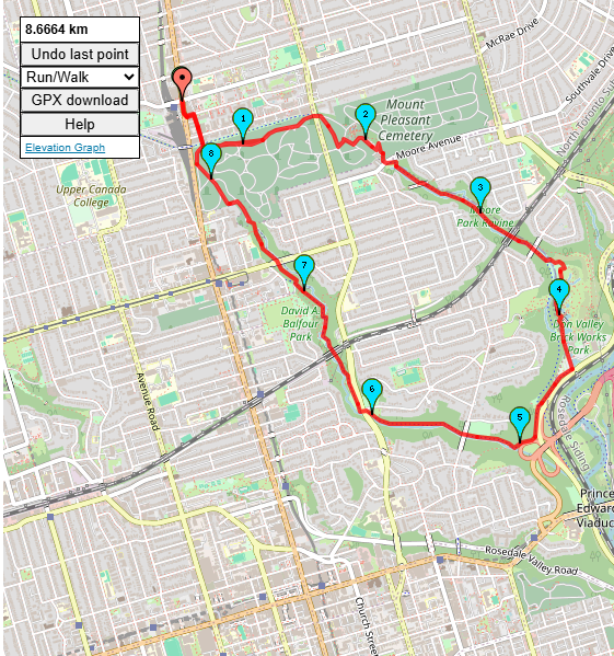 DISTANCE: 9 km PACE: about 5 km/h DIFFICULTY: D3 We will be walking at a pace of 5 km/hr. We will be starting at Davisville Station. We will then go through Mt. Pleasant Cemetery We will follow some trails to get to Brickworks. We will go up through David Balfour Park to return to Davisville Station. We are starting at 9:30 am. I expect to finish