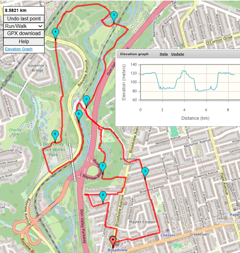 So, the random hike picker has selected this urban hike for this evening. This 9 KM hike will both start and finish at Broadview Station. The hike will be on a combination of sidewalks, paved park paths, single track dirt trails, gravel trails and a decommissioned railway track. In terms of hills, there should be a 25 meter climb and a 50 meter climb. I usually carry a pair of icers