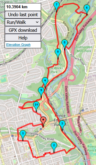 So, the random hike picker has selected this urban hike for this evening. This 10 KM hike will both start and finish at Castle Frank Station. The hike will be on a combination of sidewalks, paved park paths, gravel trails, single track dirt trails and a decommissioned railway track. In terms of hills, there should be 1 climb of 25 meters and 1 climb of 50 meters. I usually carry a pair of icers