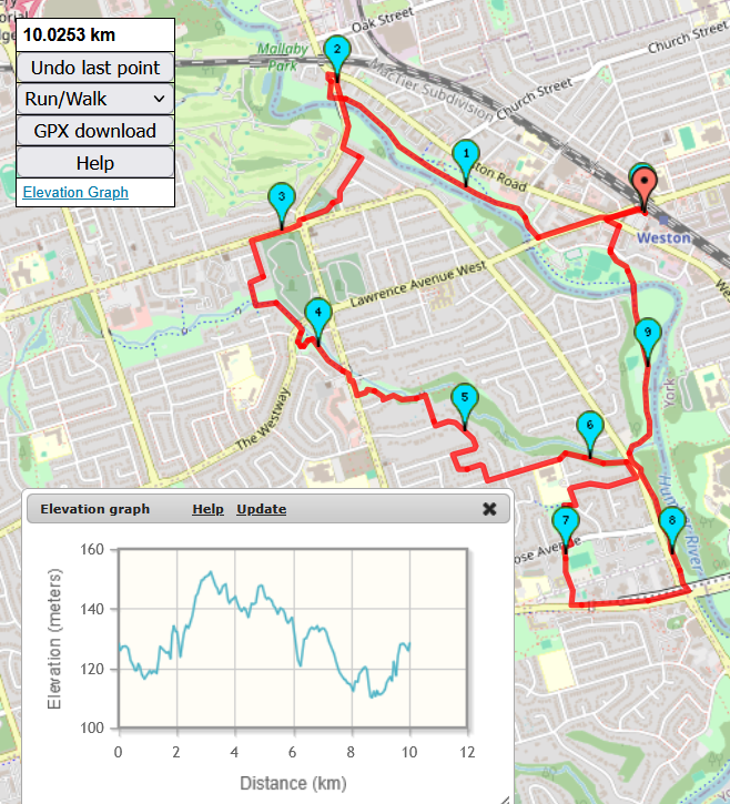 So, trying a brand new hike in the north humber area today. This 10.5 KM hike will both start and finish at Weston GO / UP Station. The hike will be on a combination of paved park paths, sidewalks, single track dirt trails and grassy fields (which might be a bit wet since its winter) In terms of hills, there should be 3 hills of 25 meters. I'll attempt to stop for a washroom break at the skating rink at Valleyfield Park located about 4 KM into the hike. I usually carry a pair of icers