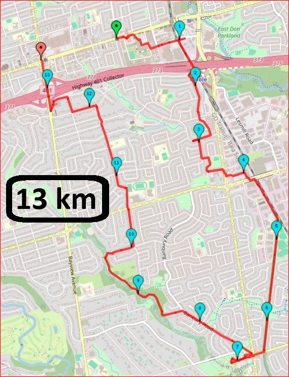 DISTANCE: about 13 km PACE: about 4.5 km/h DIFFICULTY: D3 WASHROOMs 1: Ethennonnhawahstihnen' Community Recreation Centre and Library at start WASHROOMs 2: in Edwards Gardens 1/2 way SNACKBREAK: in Edwards Gardens The hike will be on a mix of paved surfaces,