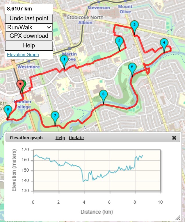 This 9 KM hike will both start and finish at Humber College Station. The hike will be on a combination of sidewalks, paved park paths, single track dirt trails and grassy fields. In terms of hills, there should be about 3 climbs of 25 meters. I'll attempt to stop for a washroom break at the Albion Arena. I usually carry a pair of icers