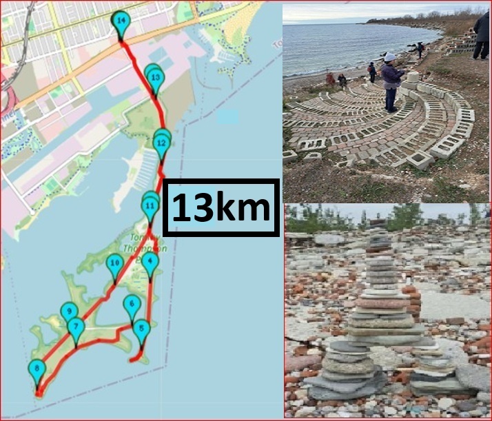 DISTANCE: about 13 km PACE: about 4.5 km/h DIFFICULTY: D3 WASHROOMs: a few port-o-potty locations in the park This hike will be on level paved and gravel paths, and a short walk on the rocky beach This is the route:
