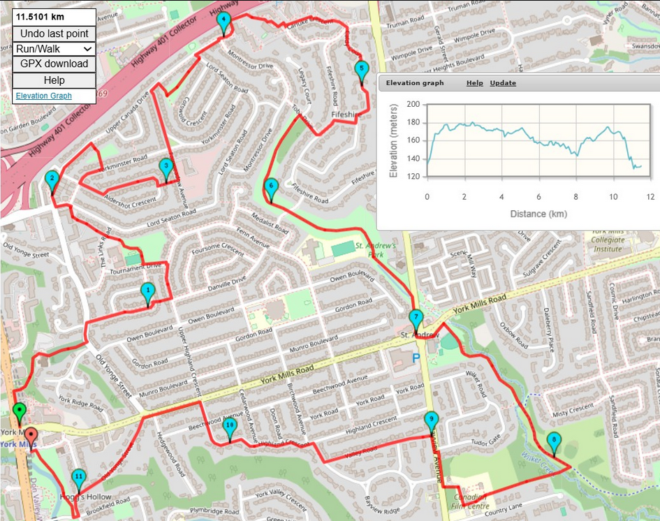 This 12 KM hike will both start and finish at York Mills Station. The hike will be on a combination of sidewalks, single track trails, paved park paths and grassy fields. In terms of hills, there's a 50 meter climb right at the beginning of the hike and one other 25 meter climb. I'll attempt to stop for a washroom break the York Mills Arena, located about 7.5 KM into the hike. I usually carry a pair of icers
