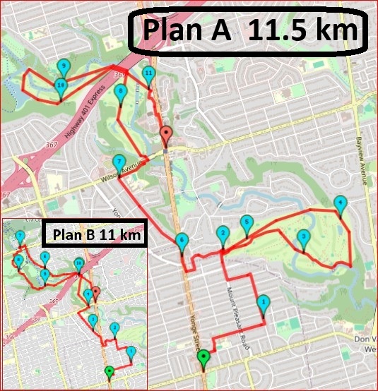 DISTANCE: about 11.5 km PACE: about 4.5 km/h DIFFICULTY: D3 WASHROOMs: Loblaws at 6 km SNACK BREAK: somewhere on the trail when we get hungry ICERS: we may need icers for this hike. Be prepared. You must keep icers in your pack during the winter months. as of Wed Dec 24, 2025 the forecast shows about 10 cm of snow on Friday, so I am hoping the Rosedale Golf Course will be open to the public for walking (Plan A). If not, then we will do a few extra km on the Don Valley Golf Course and Earl Bales Park (Plan B) we will start at Lawrence station and end at York Mills station we will be doing some exploration! between km 2 to 5 that part of this hike will be new to me, specifically Rosedale Golf Course the hike will be on a mix of sidewalk, golf course, and ravine trails Plan A interactive Route Map CLICK HERE for route 996221Plan B interactive Route Map CLICK HERE for route 996222 | |||||||