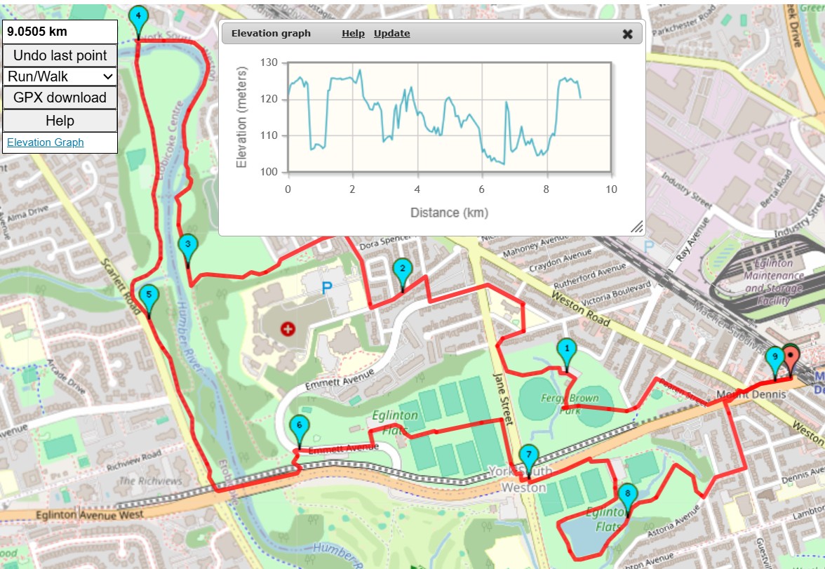 The hike will be on a combination of sidewalks, single track dirt trails, open fields and paved park paths. In terms of hills, there should be 5 climbs of about 25 meters. I'll attempt to stop for a washroom break in Eglinton Flats at 1 KM and a second time at 6 KM. Post hike, I might go grab a drink at the The Irish Rose Pub if anyone would like to join. | |||||||