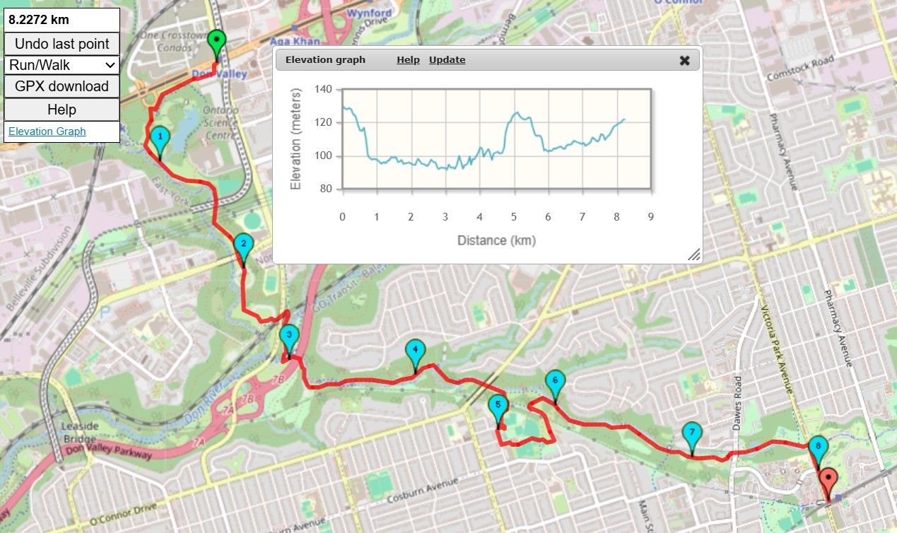 So, the random hike picker has selected this urban hike for this today This 8.5 KM hike will start at Don Valley Station and end at Victoria Park Station. The hike will be on a combination of single track dirt trails, grassy fields and paved park paths. In terms of hills, there should be two climb / staircases of about 25 meters. I'll attempt to stop for a washroom break at the Stan Walow Clubhouse at about 5 KM into the hike. | |||||||