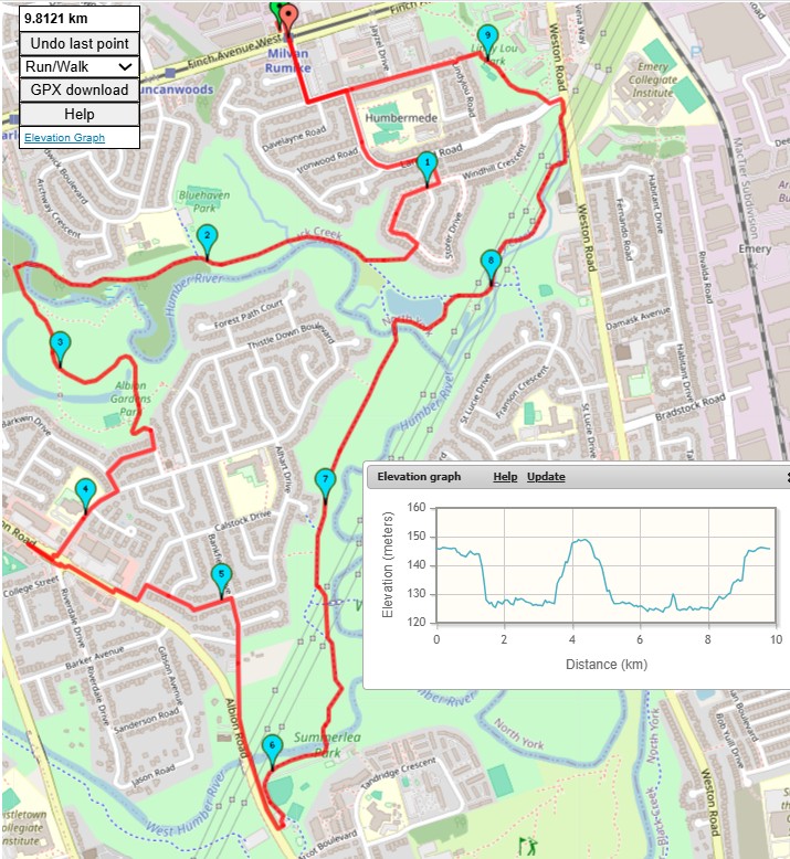 So, trying out another new hike at one of the new LRT stations on line 6. This 10 KM hike will both start and finish at Milvan Rumike Station. The hike will be on a combination of sidewalks, paved park paths, single track dirt trails and grassy fields. In terms of hills, there should be about 2 climbs of 25 meters. I'll attempt to stop for a washroom break at the Thistletown Community Centre located about 4 KM into the hike. | |||||||