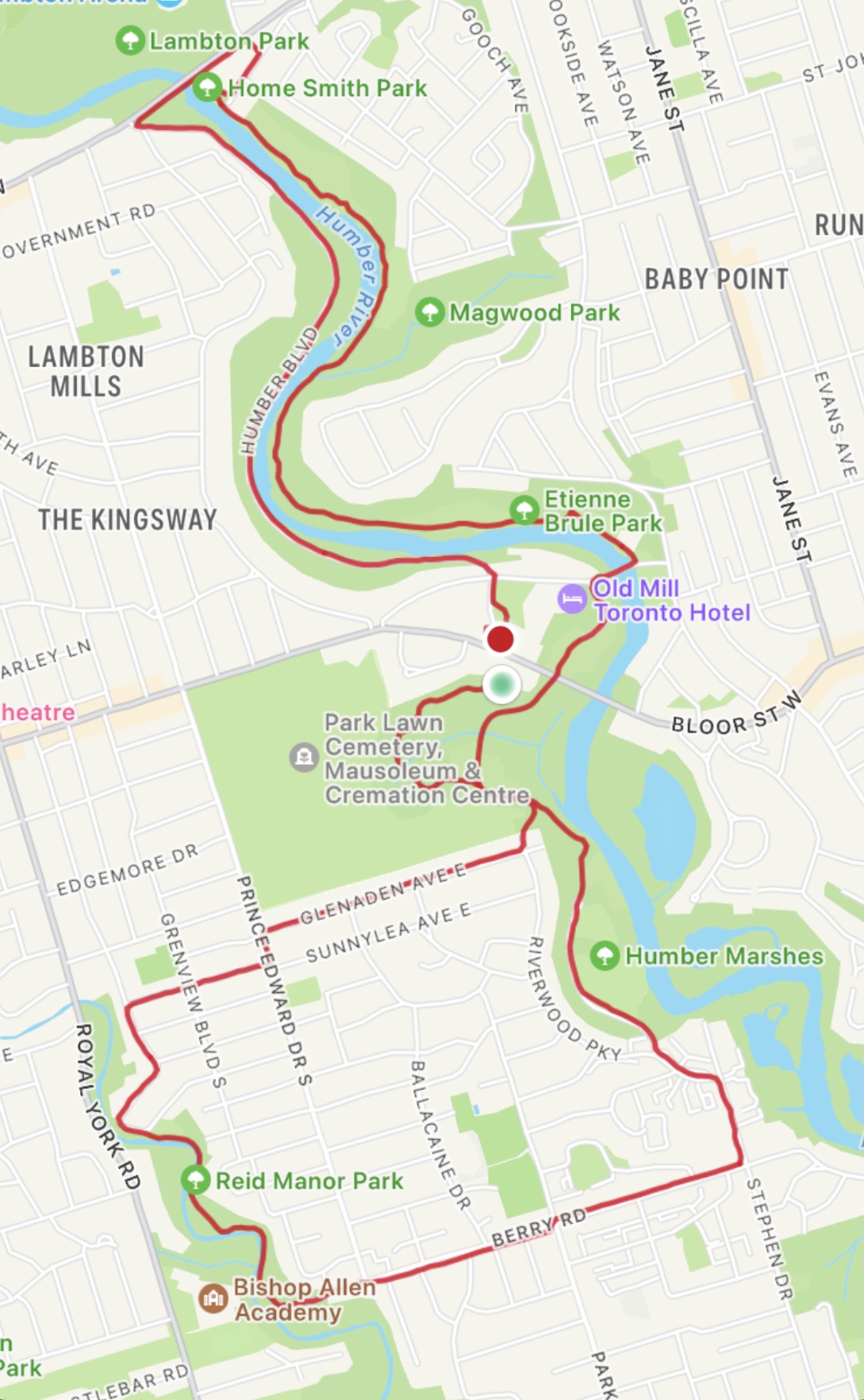 Hi everyone, this Saturday we will do a hike starting at Old Mill subway station-walking for 6km South, looping back to Old Mill station and then walking 6km North and ending back at Old Mill station. We will be walking at a moderate pace on paved paths and sidewalks for most of the hike. We will also go through Mimico creek which is a single track trail. We will have a washroom break at the bubble rink 30 minutes into the hike. Then a snack break on the 2nd part of the hike 1.5 hours in.